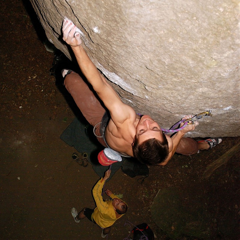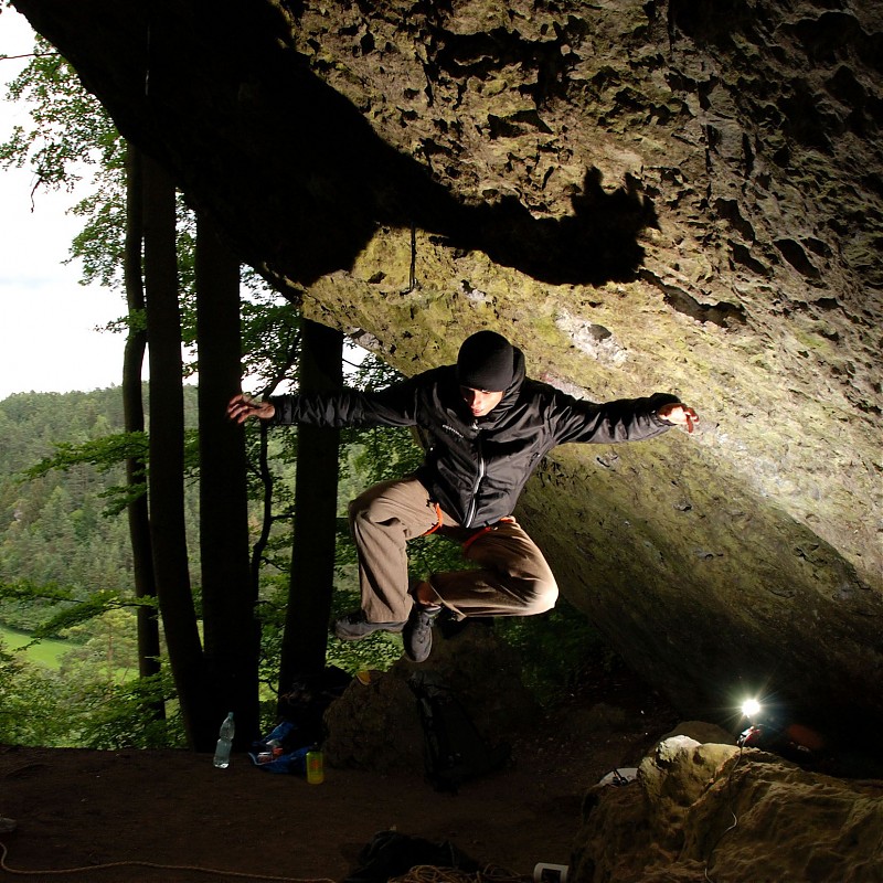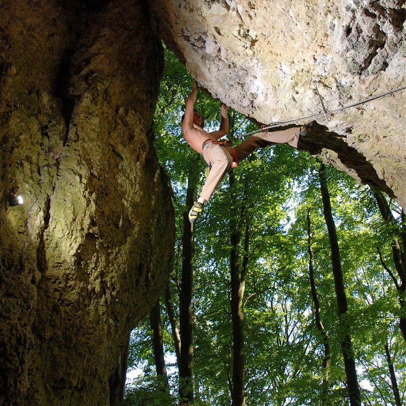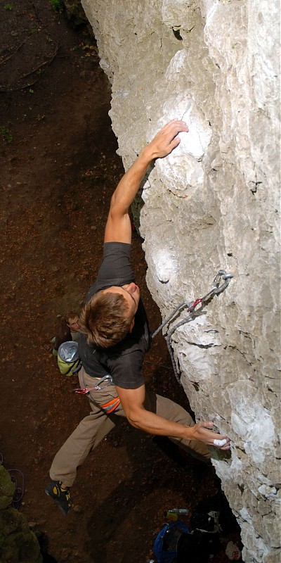 Cztery dni laby postanowiłem wykorzystać na spontaniczny wyjazd do Frankenjury. Wraz z Krzysiem, Alkiem i Maćkiem ruszyliśmy na zachód z entuzjastycznym nastawieniem, jednak Bawaria przywitała nas rzęsistym deszczem. Nie ostudziło to naszego napalenia na wspin, a po pierwszym dniu taplania w błocie i mchu zrobił się „warun”. Krzychu napadł na Zwei Muskeltiere, jak się miało później okazać – wymagające 8a, Alek z Maćkiem rzucali się na wszystko w celu zebrania jak największego koszyka przejść. Ja myślami byłem na posępnym Kanzelfelsie, gdzie miałem do odrobienia pracę domową sprzed roku. Pierwszy dzień prób na Fredzie rokował szansę powodzenia. Druga szansa pojawiła się ostatniego dnia. Godzinę przed planowanym powrotem wpiąłem się do łańcucha pięknej dyszki plus kończąc tym samym porachunki z wymagającym bulderowym pasażem. Jak to bywa w tych chwilach, przychodzi entuzjazm do dalszego wspinania, tym czasem obowiązki wzywają - wracam, by dokończyć swój dyplom.